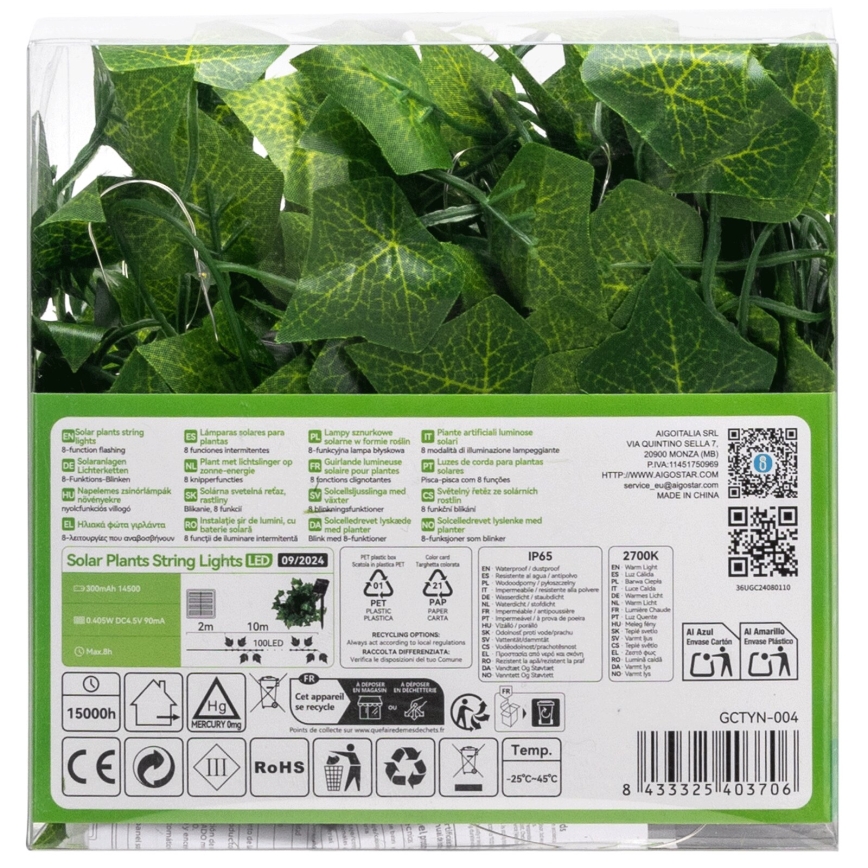 Aigostar - LED Saules ķēde 100xLED/12m IP65 300 mAh silti balta efeja