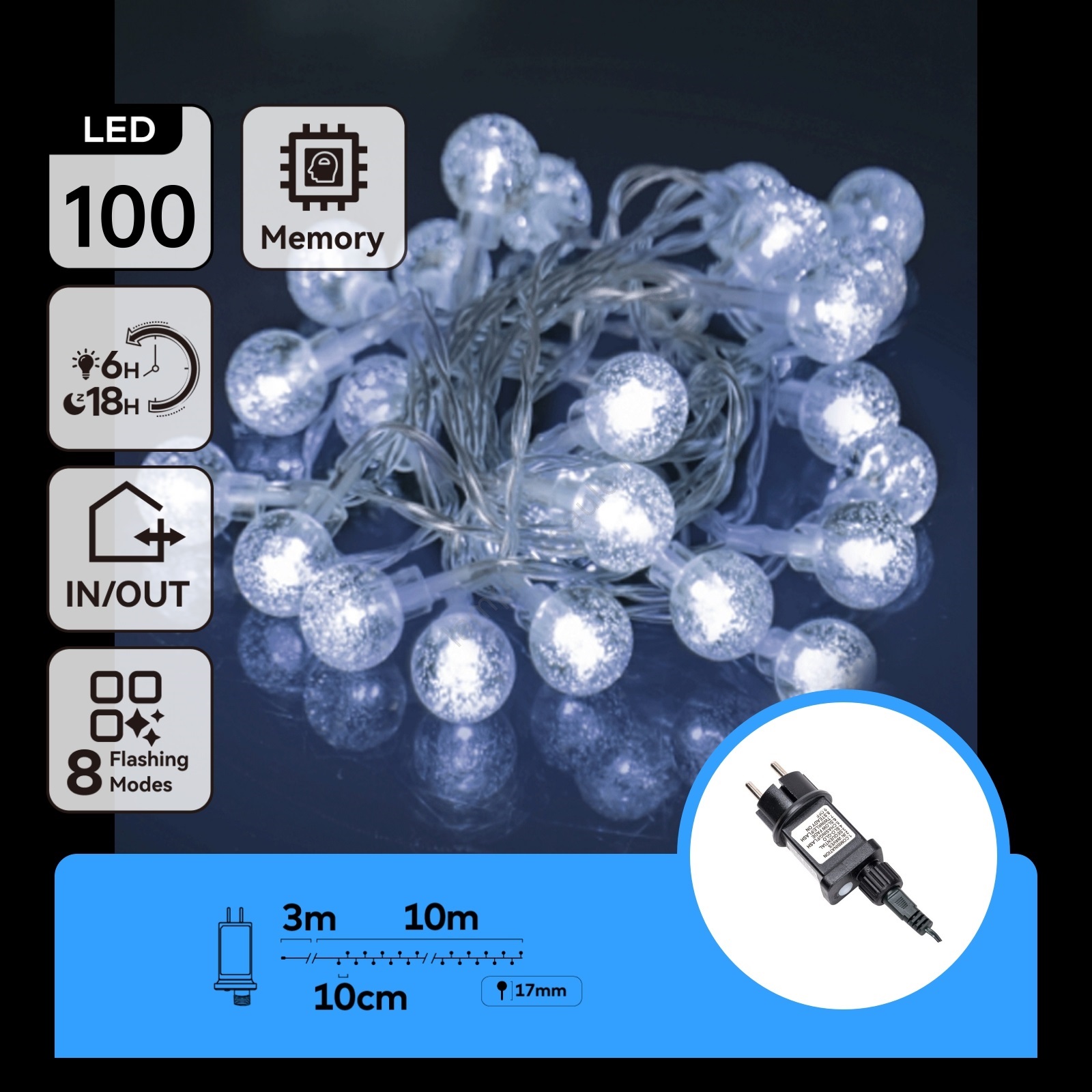 • Aigostar - LED āra dekoratīvā gaismas virtene 100x LED/8 apgaismojuma režīmi 10 m IP44 auksti balta