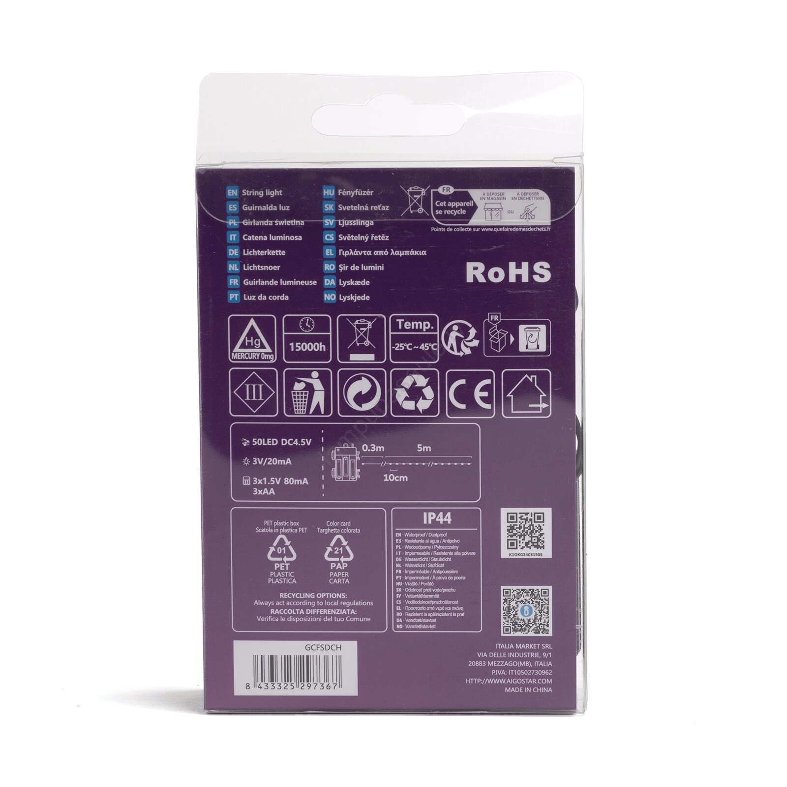 • Aigostar - LED āra virtene 50xLED/8 režīmi 3xAA 5,3m IP44 daudzkrāsaina