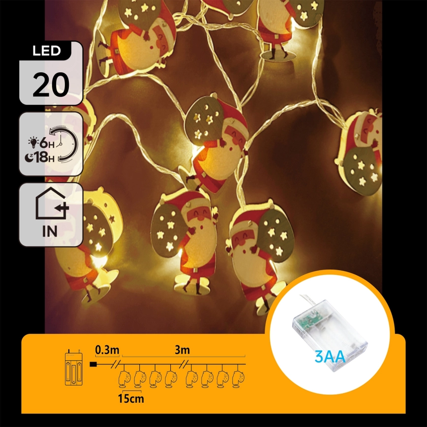 Aigostar - LED virtene 20xLED/3xAA, 3 m, siltā balta, Ziemassvētku vecītis