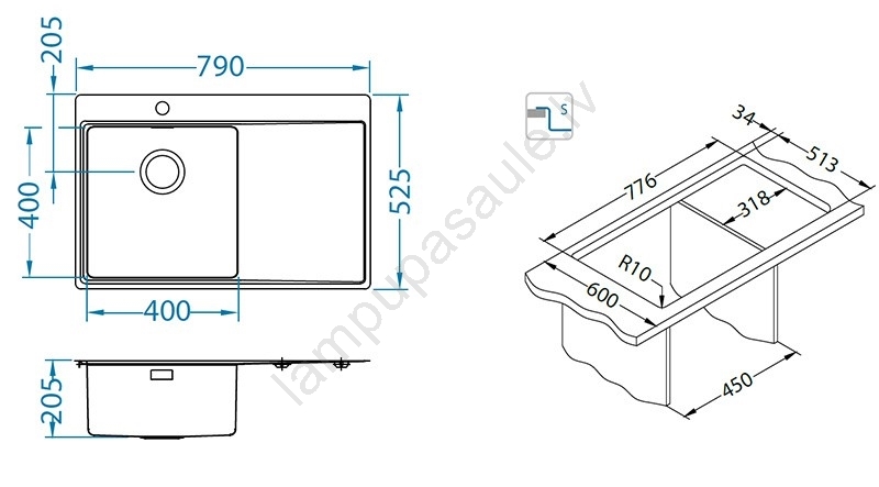 ALVEUS 1149516 - Virtuves izlietne PURE 79x52,5 cm, satīna apdare, labās puses | Lampupasaule