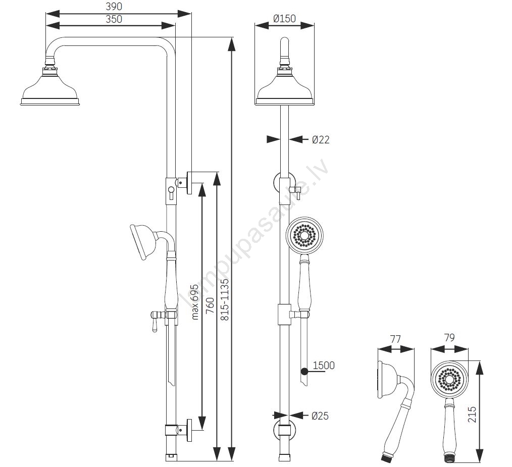 • Dušas stienis un virsējā duša no nerūsējošā tērauda ar PVD pārklājumu.
