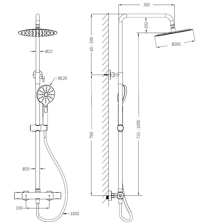 • Dušas stienis un augšējā duša no nerūsējošā tērauda ar PVD virsmas apdari.