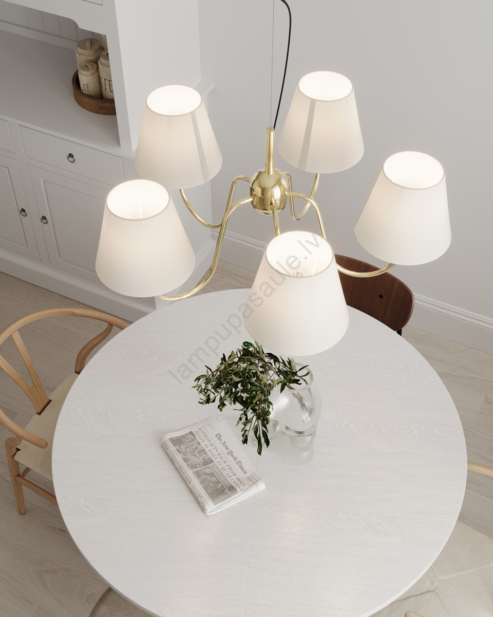 ByRydens - Lustra uz troses LYNF 5xE14/8W/230V misiņš/balts izceļas ar jauku un funkcionālu dizainu.  Spuldze ar E14 cokolu irpiemērota lampai. Šeit, varat iegādāties citas spuldzes par izdevīgām cenām. Tā būs interesants jūsu mājas papildinājums.