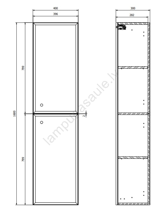 • Priekšpuse, korpuss un trīs iekšējie plaukti ir izgatavoti no 16mm skaidu plātnes ar matētu baltu laku.