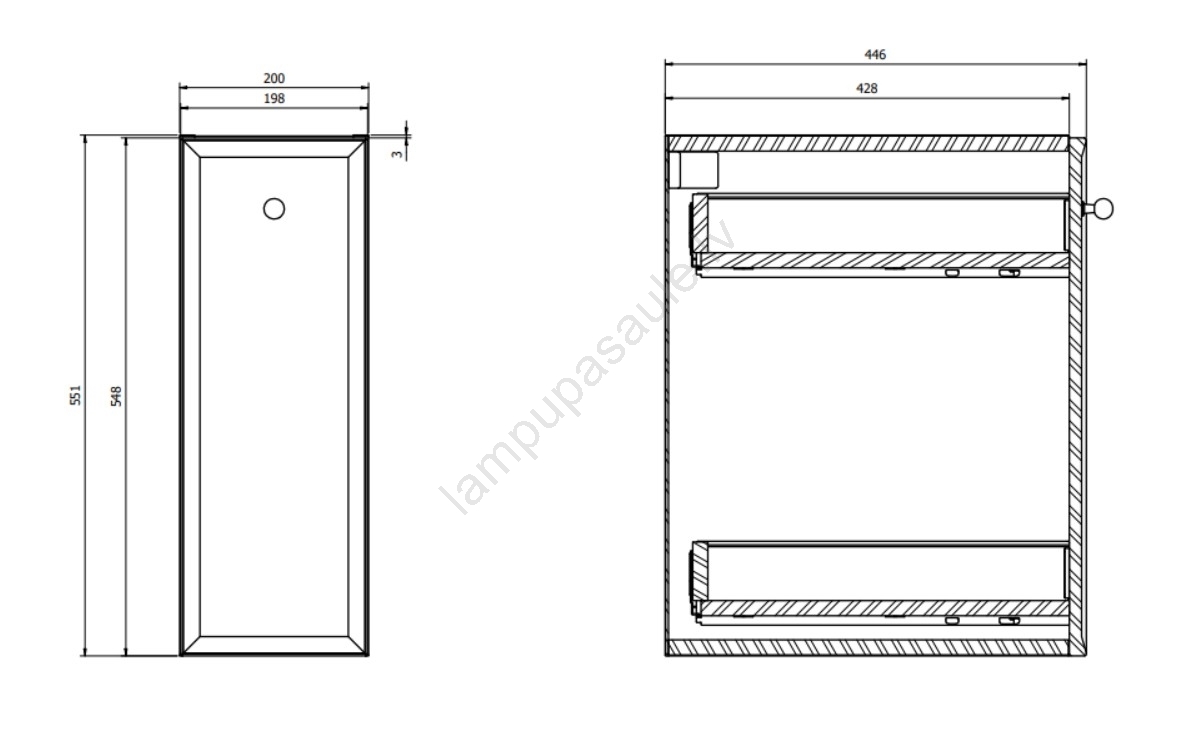 • Priekšpuse, korpuss un iekšējās divas plauktas ir izgatavotas no 16 mm skaidu plātnes ar matētu baltu laku.