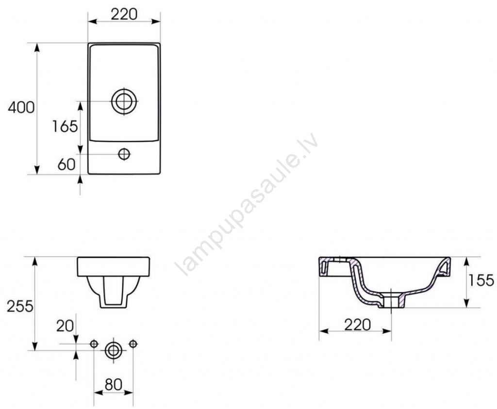 • Keramikas izlietne ir klasiskā taisnstūra formā ar atveri jaucējkrānam un pārplūdes atveri.