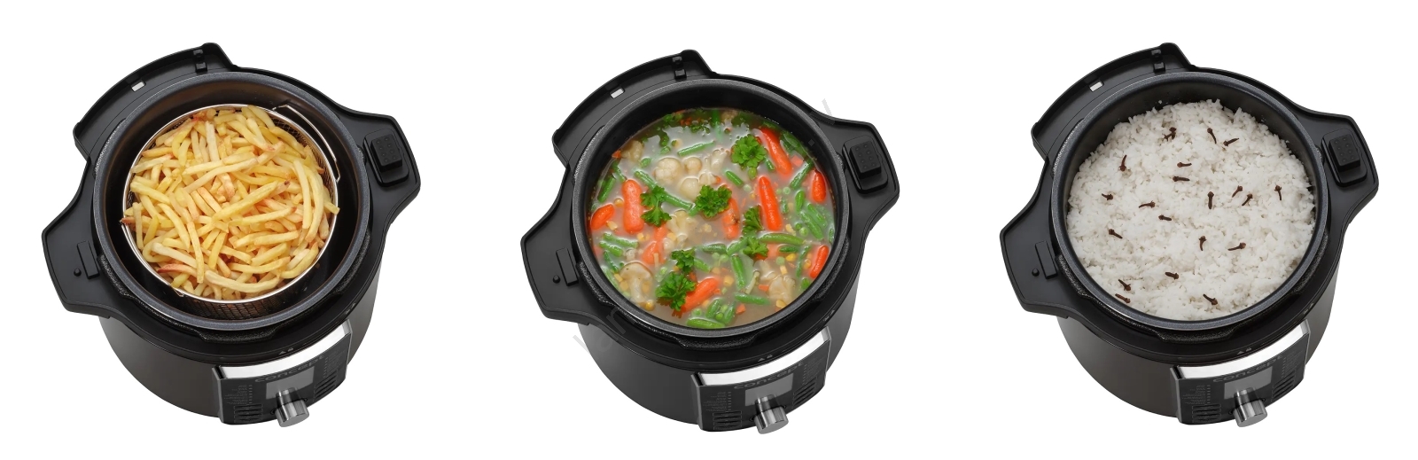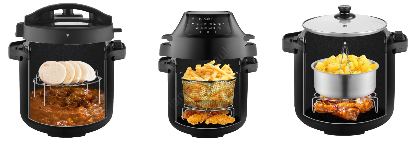 • 11 vienā: tvaika katls, gaisa fritéze, spiediena katls, lēnās gatavošanas katls, rīsu vārītājs, zupu vārītājs, cepeškrāsns, žāvētājs, jogurta raudzētājs, panna, vārīšana.