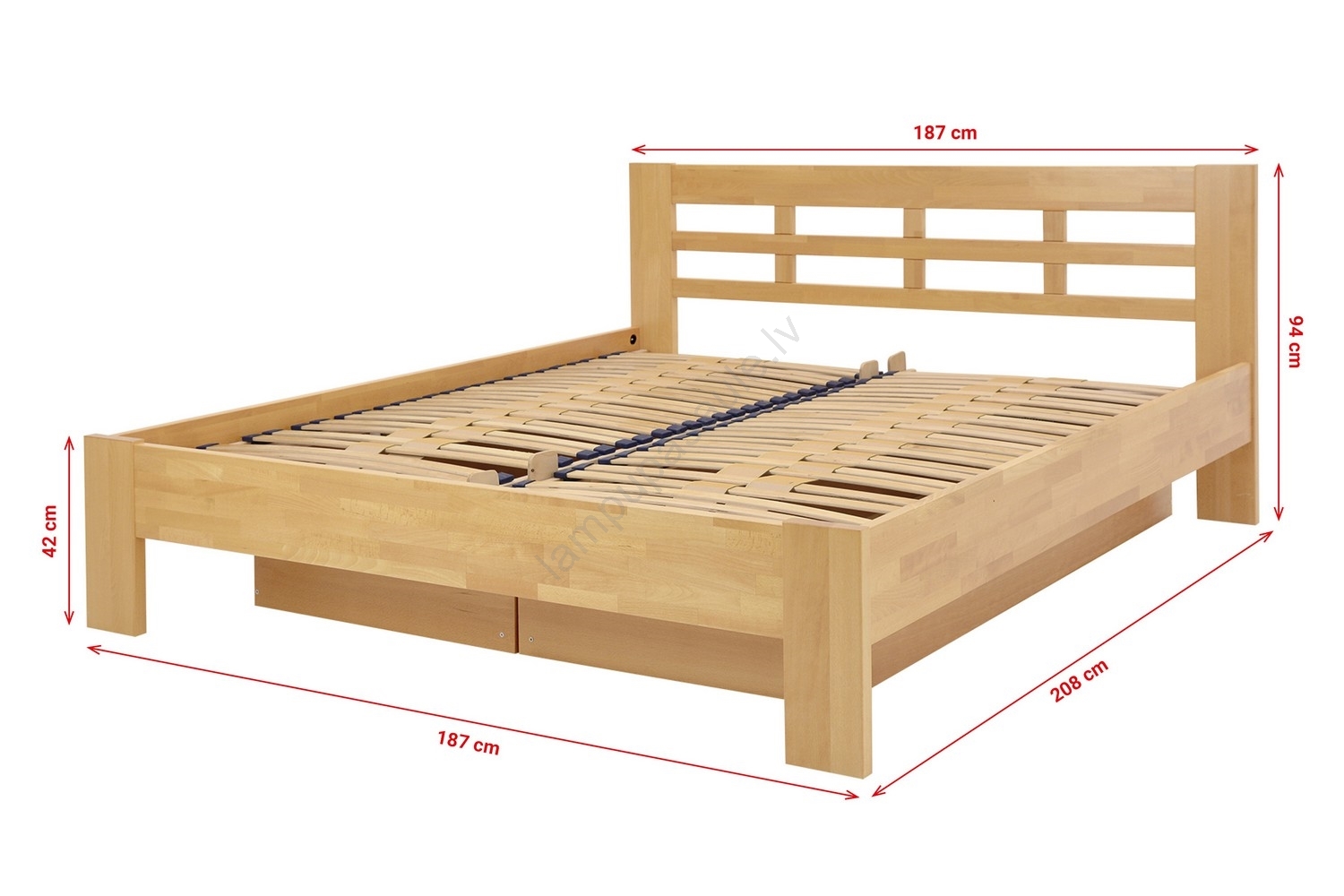 • Tā stāv uz masīvkoka kājām, kas garantē augstu gultas stabilitāti.