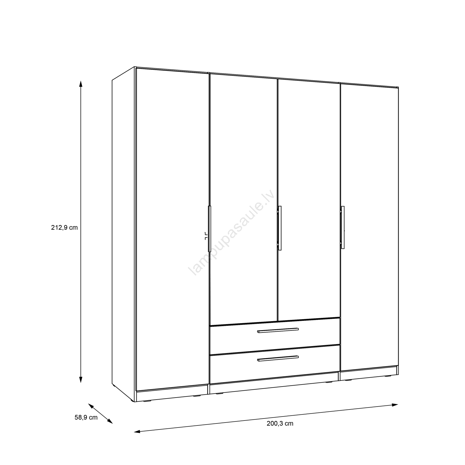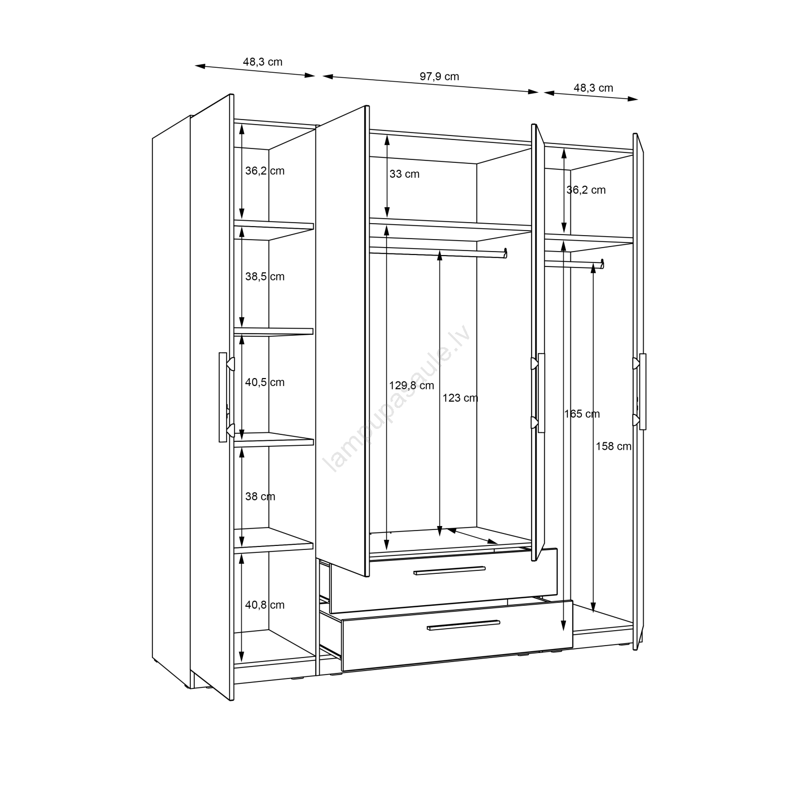 • Skapis aprīkots ar drēbju stieņiem, atvilktnēm, plauktiem un plašu uzglabāšanas vietu jūsu apģērbam, somām un sezonas lietām.