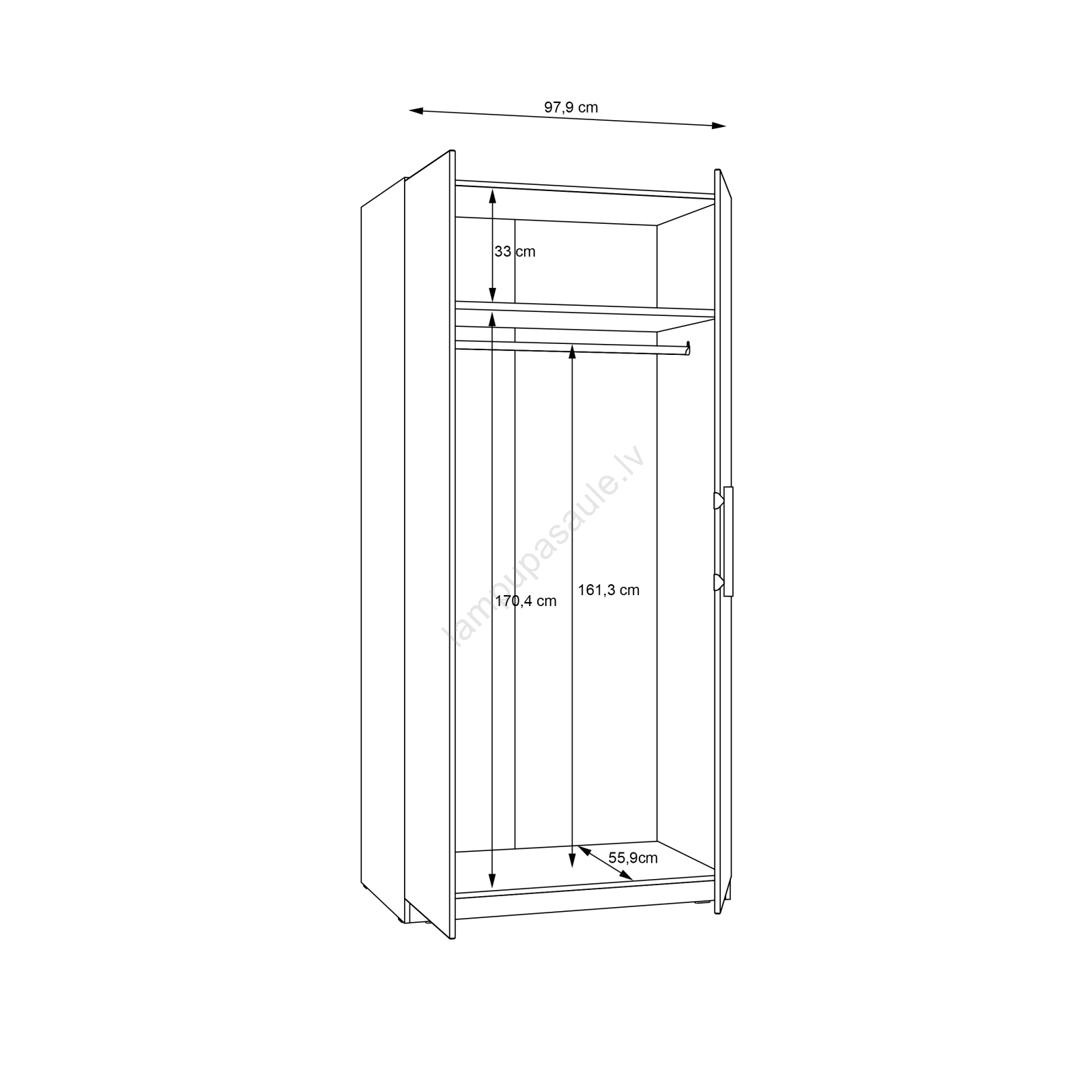• Skapis ir aprīkots ar drēbju stieni, plauktu un plašu uzglabāšanas nodalījumu jūsu apģērbam, somām un sezonas lietām.