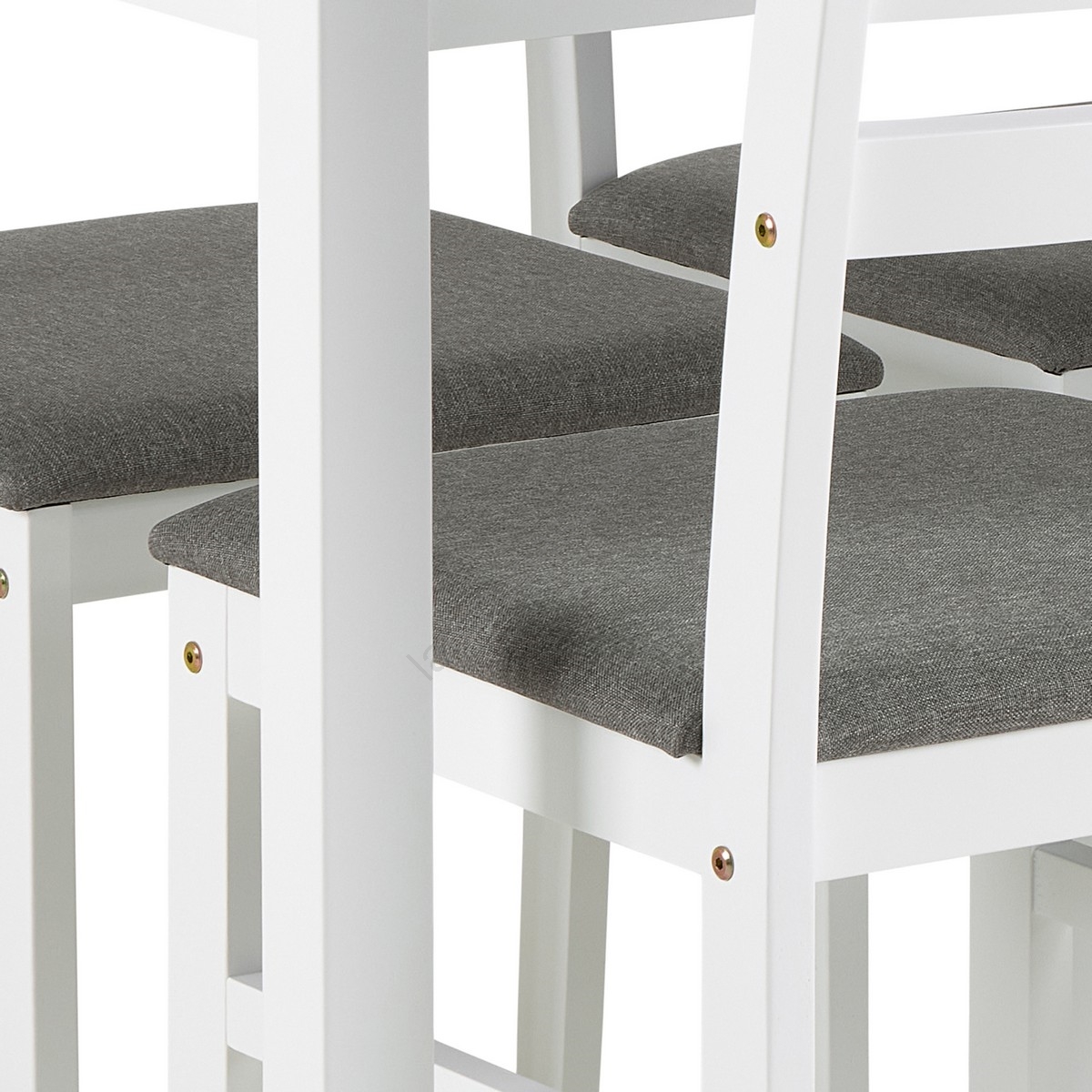 • Sastāv no taisnstūra ēdamgalda un 4 atbilstošiem krēsliem ar polsterētām gaiši pelēkām sēdvietām, viss izgatavots no masīvkoka baltā apdarē.