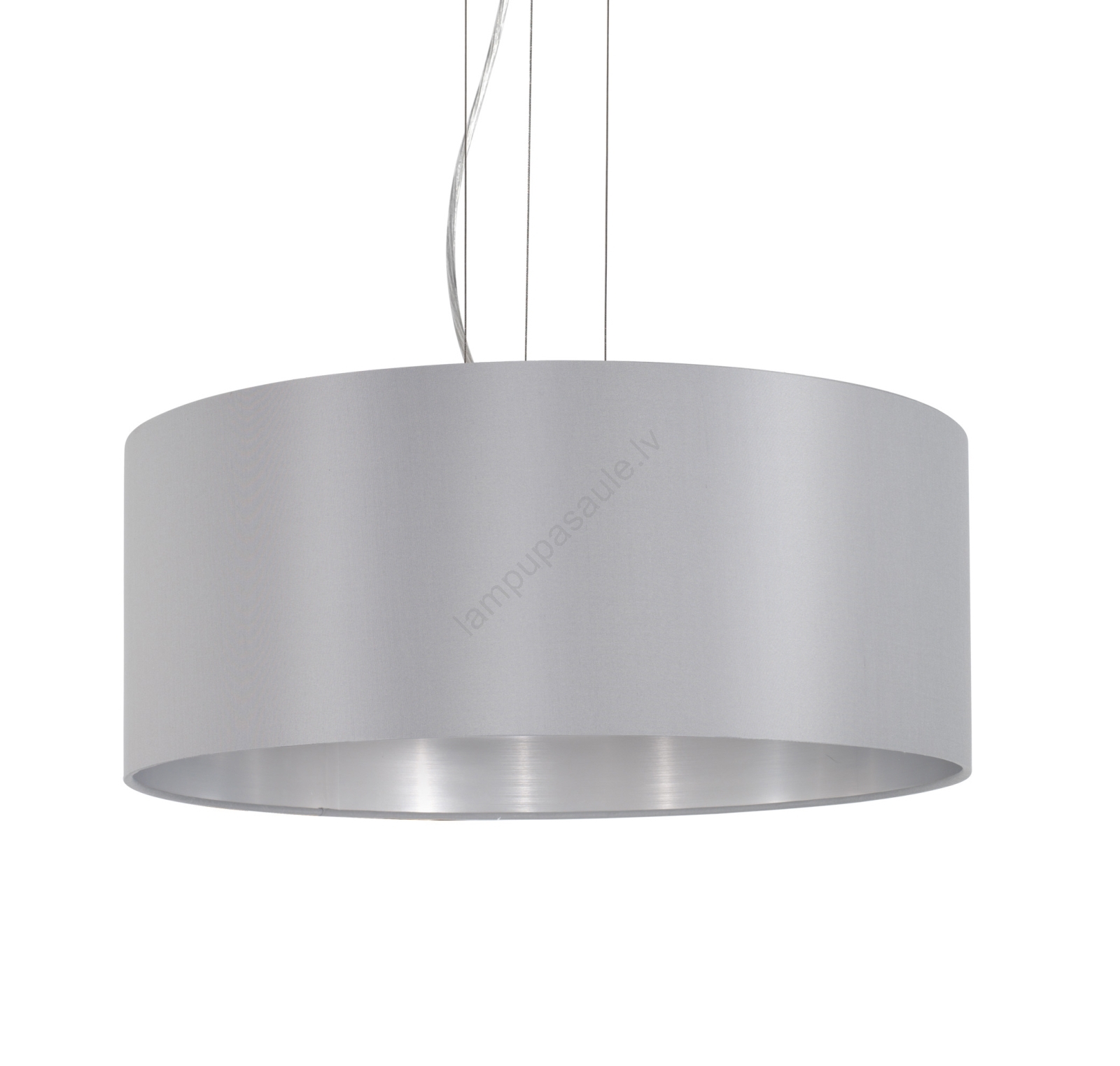 • Gaismekļa izskatu uzsver tekstila abažūrs ar ārējo pelēko un iekšējo sudraba krāsu, papildināts ar metāla piekari.