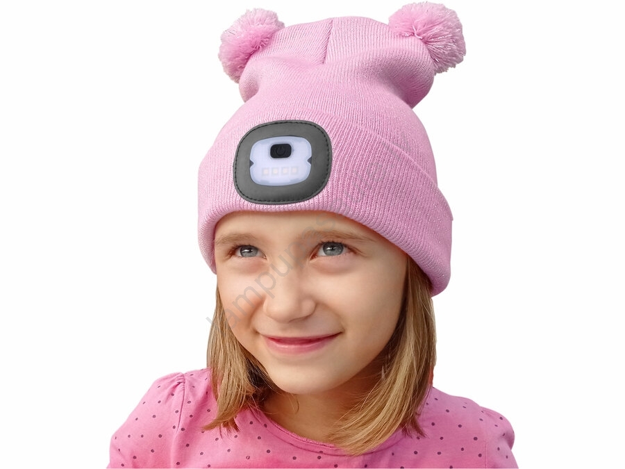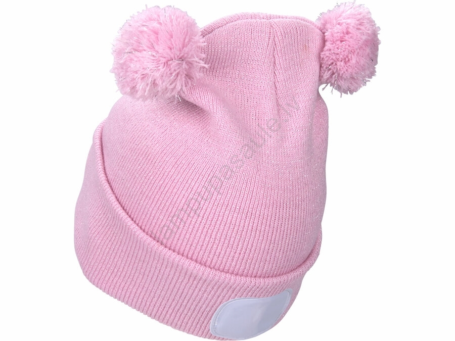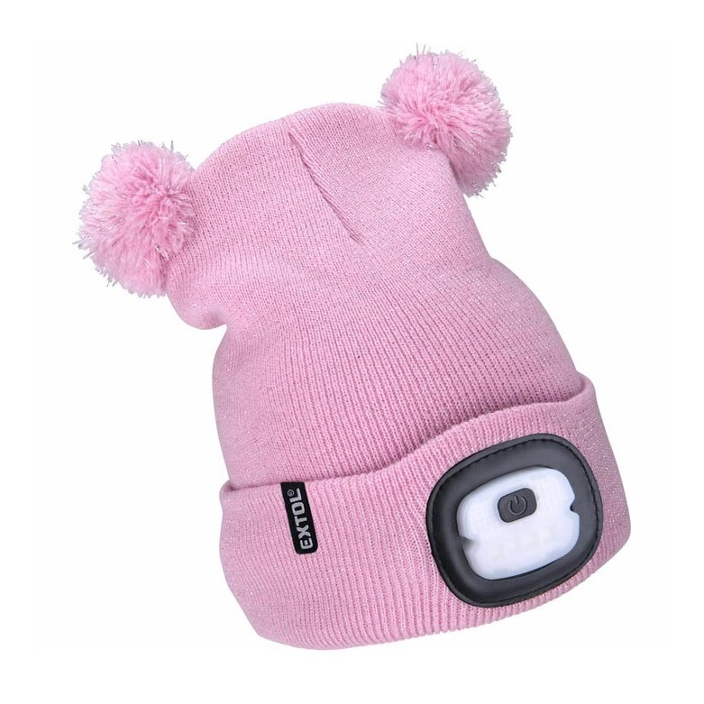 Extol - Bērnu cepure ar iebūvētu galvas lukturīti un USB uzlādi 250 mAh, rozā ar pomponiem