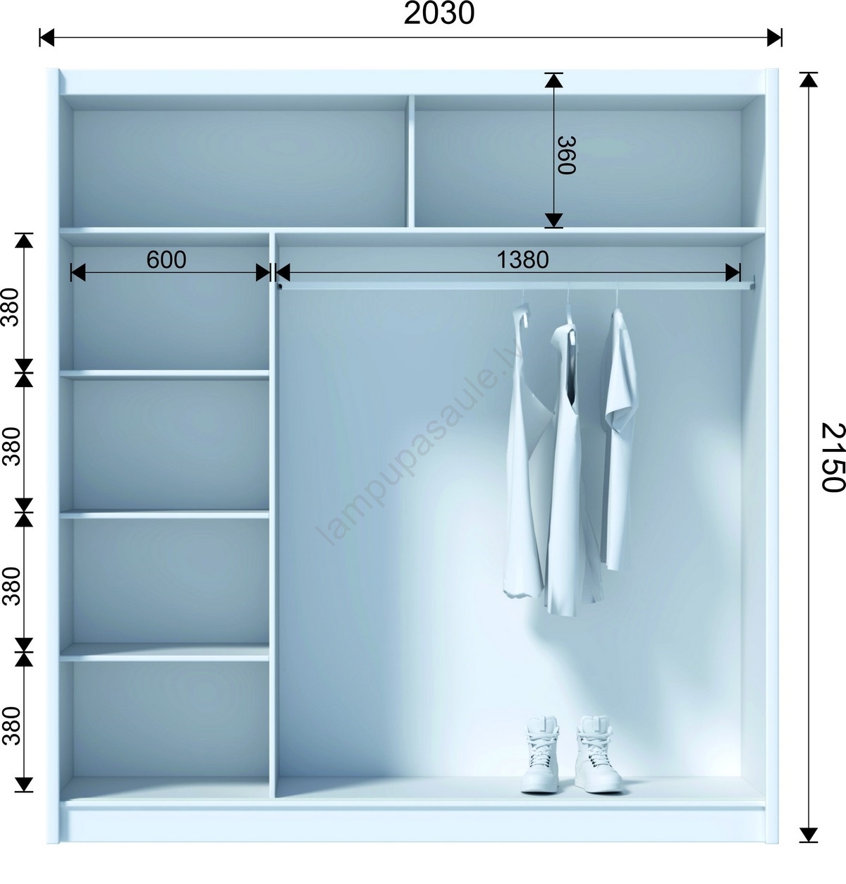 • Skapis aprīkots ar 4 atvērtajiem plauktiem, drēbju stieni un 2 augšējiem plauktiem somu un sezonas lietu uzglabāšanai.