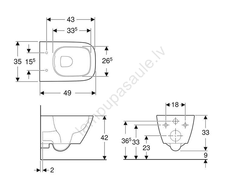 • Pie sienas piestiprināms tualetes pods ar slēgtu formu un īsāku izvirzījumu.
