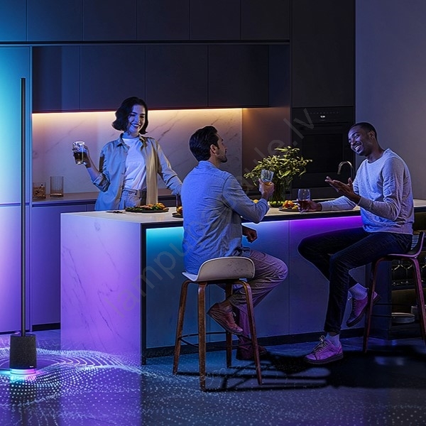 • Lampa aprīkota ar BT 5.3 skaļruni ar efektu vienību – to var izmantot kā skaļruni telefonam, televizoram vai kā baltā trokšņa ģeneratoru.