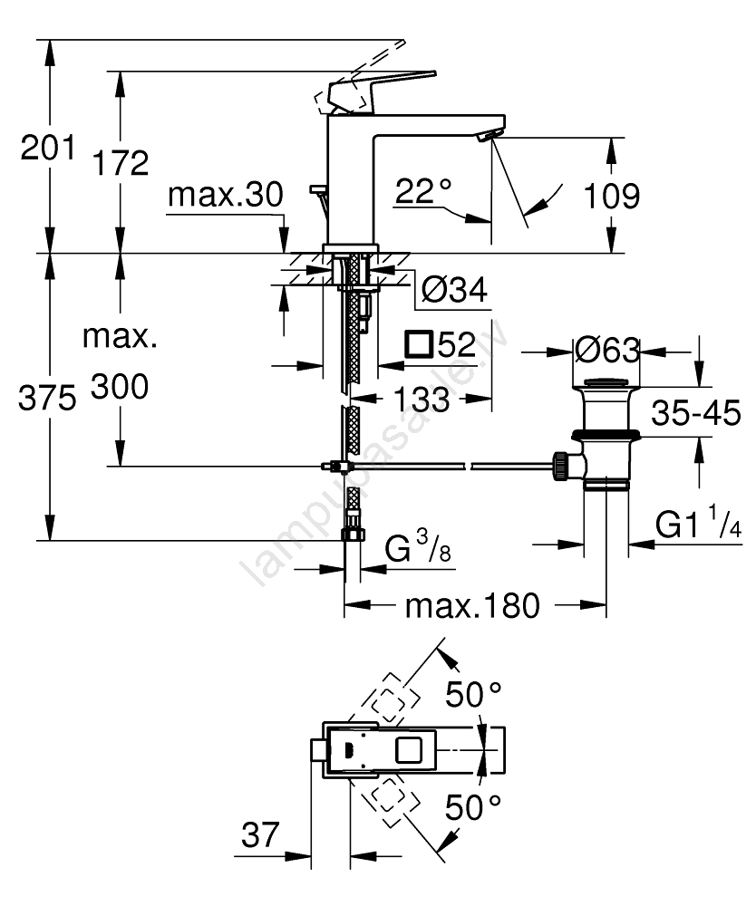 • GROHE Water Saving tehnoloģija samazina ūdens patēriņu līdz 5 l/min, saglabājot optimālu plūsmu.