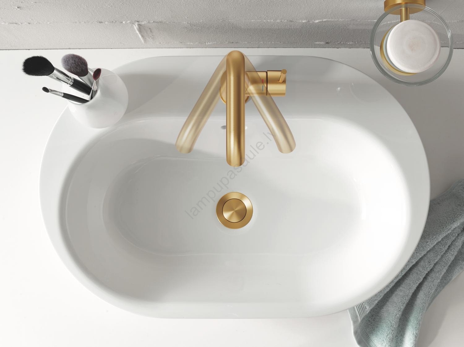 • Elegants GROHE Essence izlietnes jaucējkrāns ar sviru apdarē Brushed Cool Sunrise.