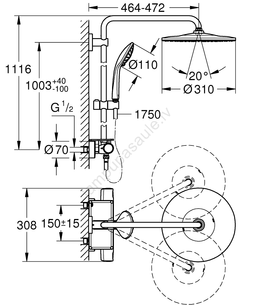 • Horizontāli grozāma dušas roka 450 mm garumā elastīgai regulēšanai.