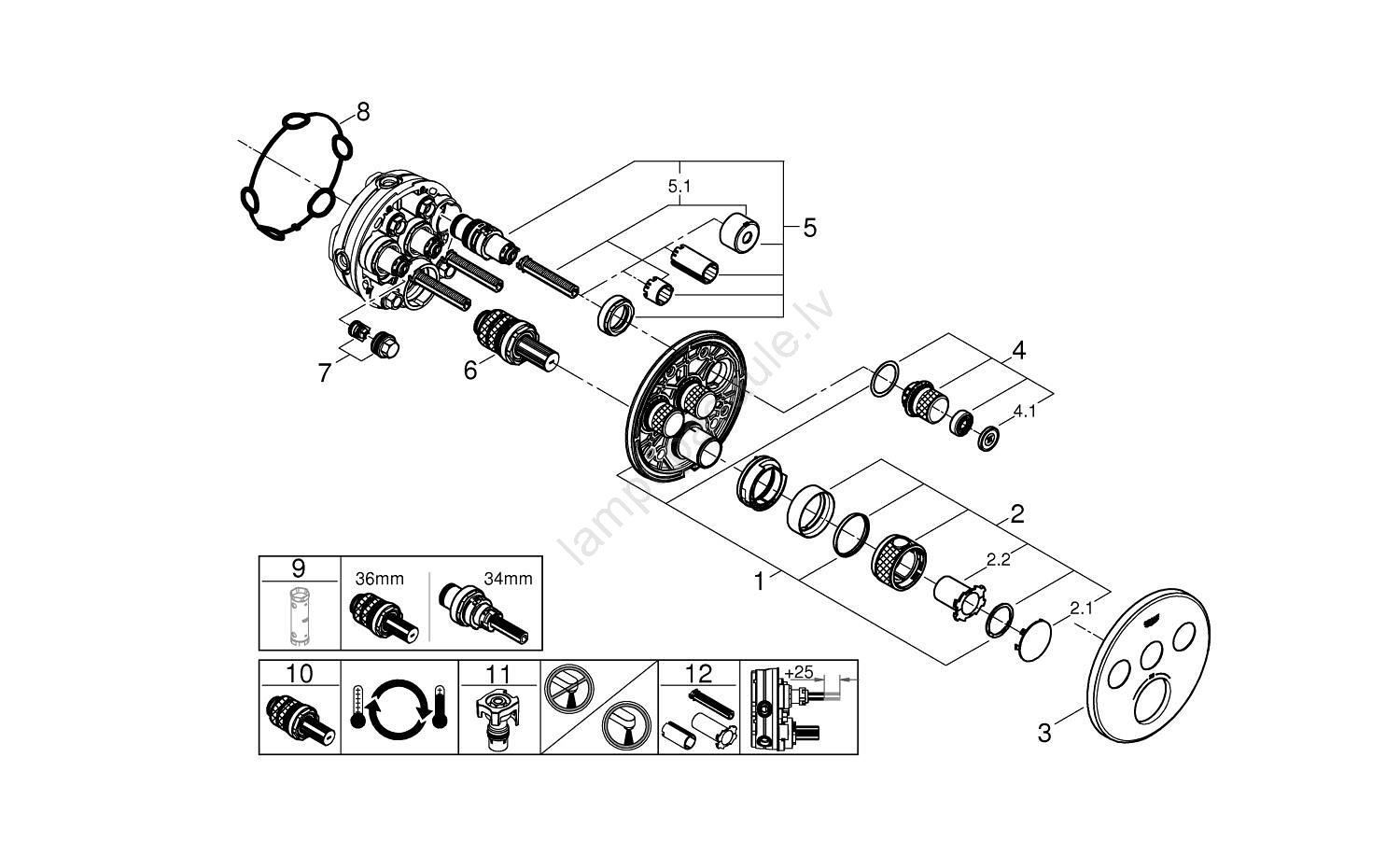 • Komplekts galīgai uzstādīšanai ar termostatu iebūvējamai montāžai ar trim vārstiem.
