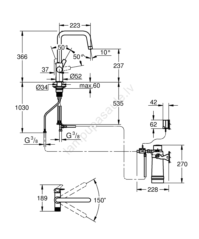 • Pagriežams cauruļveida snīpis ar 150° pagriešanas leņķi atvieglo lielu katlu un karafu pildīšanu un tīrīšanu.