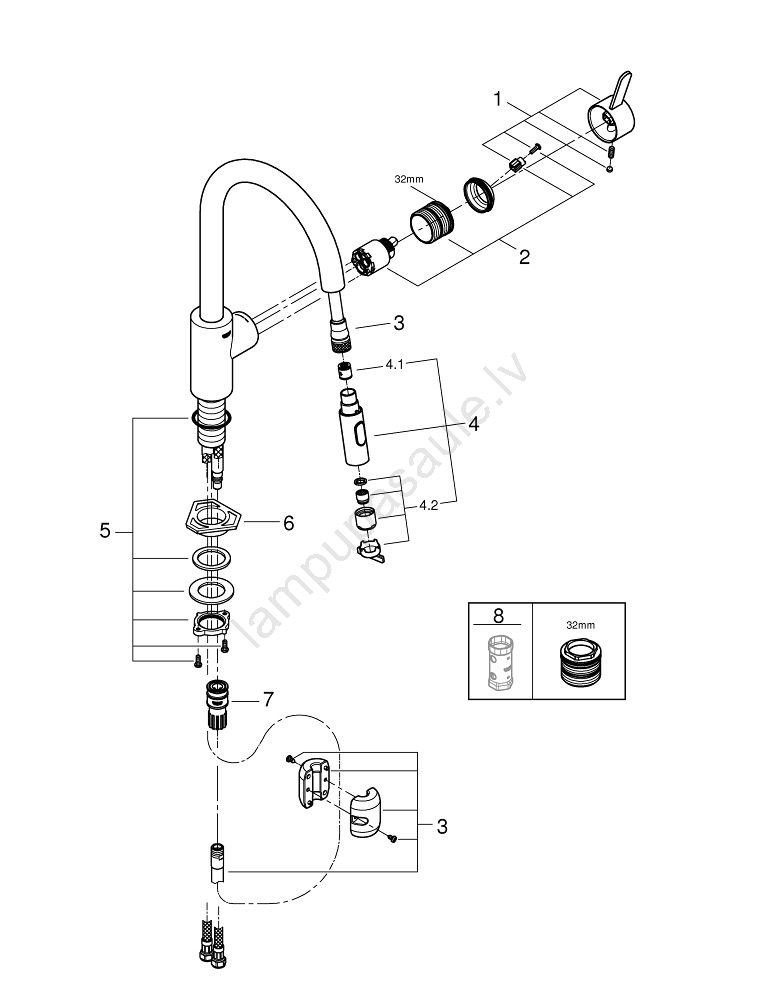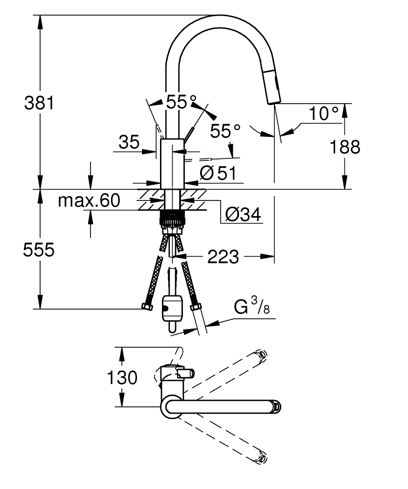 • GROHE EasyDock tehnoloģija nodrošina plūdenu izsmidzinātāja atgriešanos vietā.