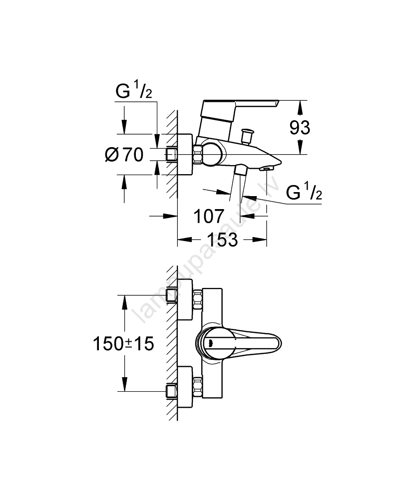 • Sienas uzstādāms vannas jaucējkrāns ar sviru ērtai vadībai.