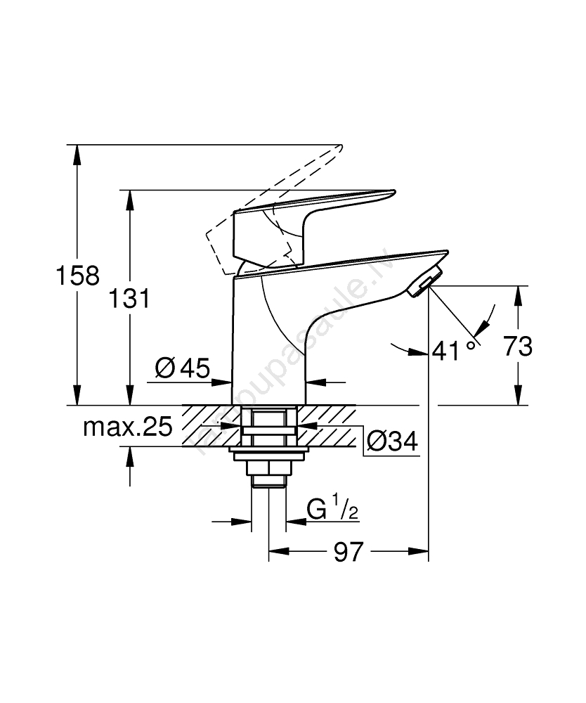 • Jaucējkrāna augstums: 131 mm, iztecēja garums: 97 mm, komforta zona: 73 mm.
