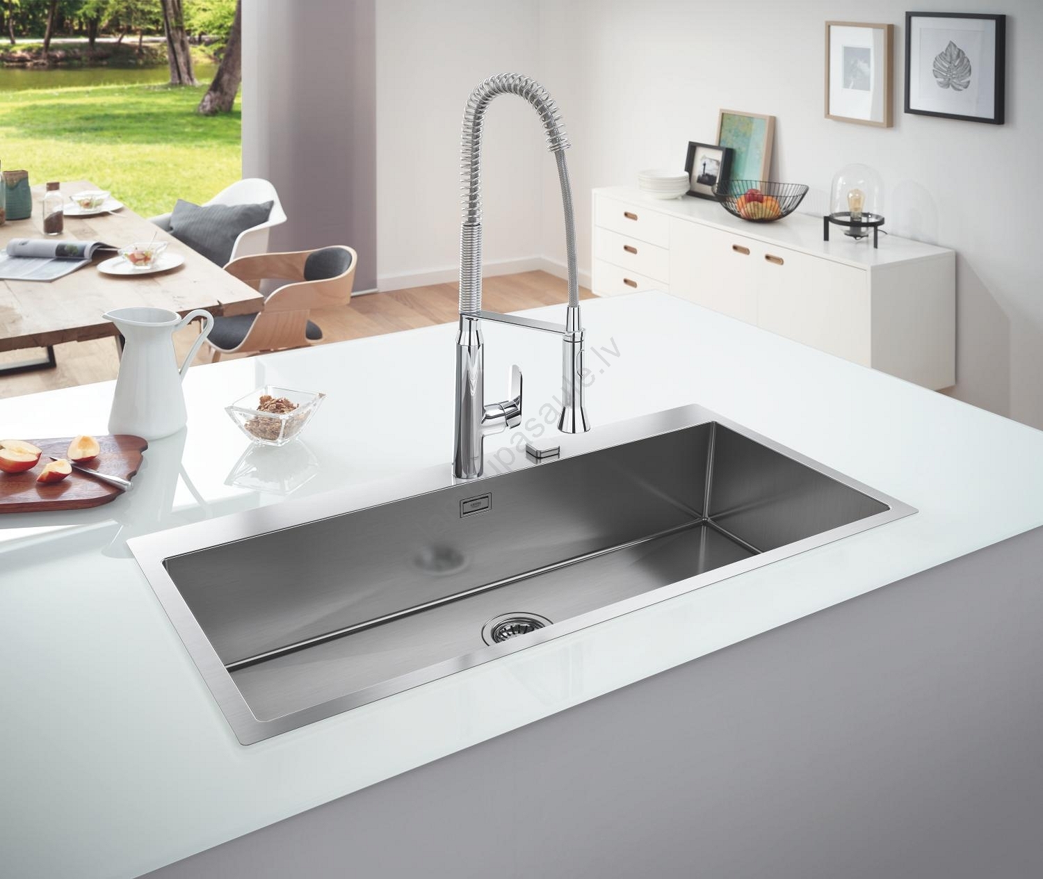 • Profesionāls dušas izsmidzinātājs ar 360° pagriešanās diapazonu nodrošina maksimālu elastību trauku mazgāšanā un izlietnes tīrīšanā.