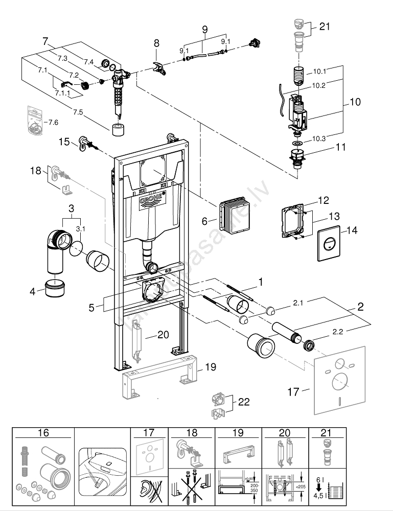• Pilns 3‑in‑1 uzstādīšanas komplekts piekaramai tualetei ar montāžas augstumu 1,13 m.