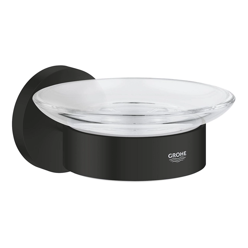 • Elegants ziepju trauks ar turētāju matētā melnā krāsā — modernam vannas istabas izskatam.