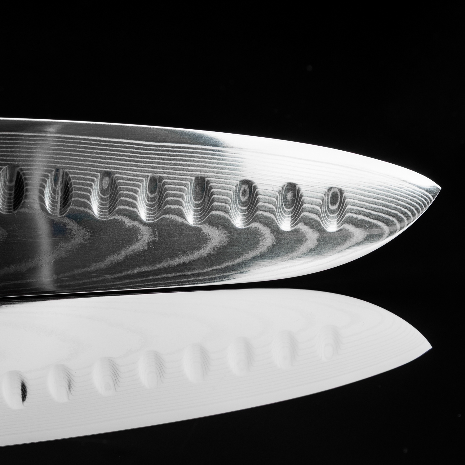 • Asmeni ar garumu 180 mm veido 67 kārtas damasta tērauda ar cietu VG10 kodolu, kas nodrošina izcilu asumu un ilgstošu asmens stabilitāti.