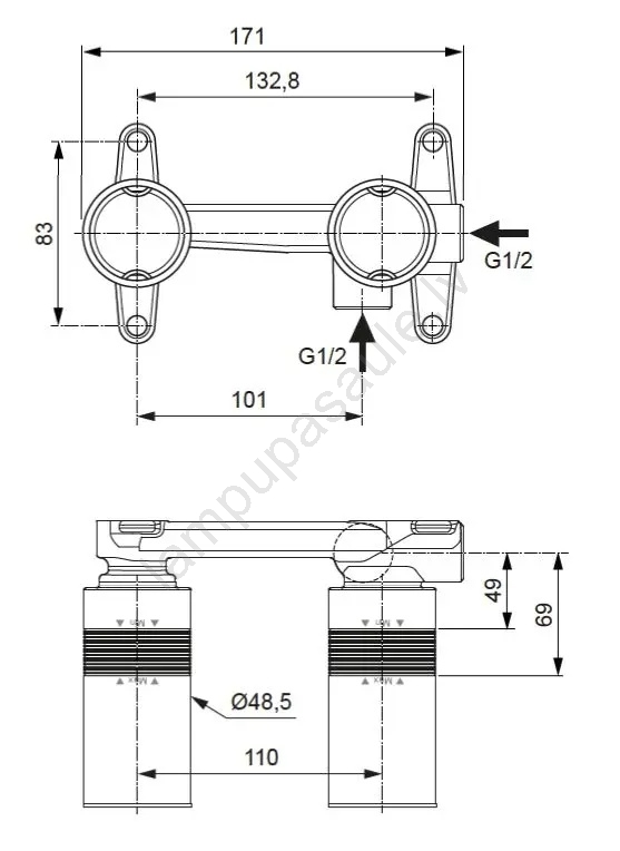 • Iebūvējamā daļa kalpo kā montāžas korpuss Ideal Standard izlietnes iebūvējamajiem jaucējkrāniem.