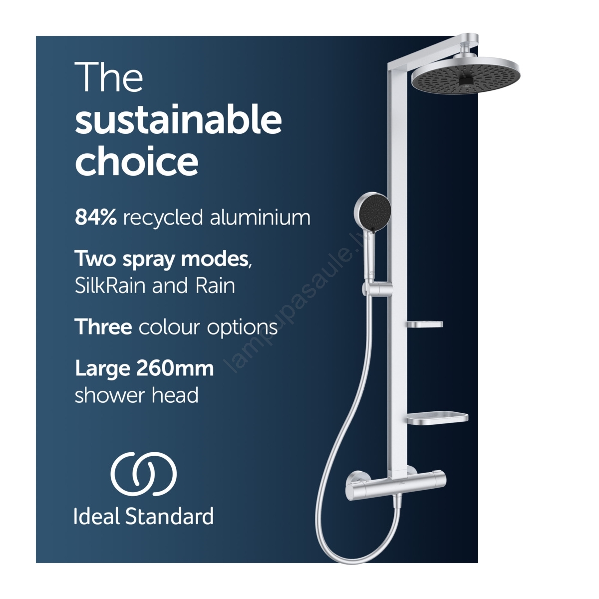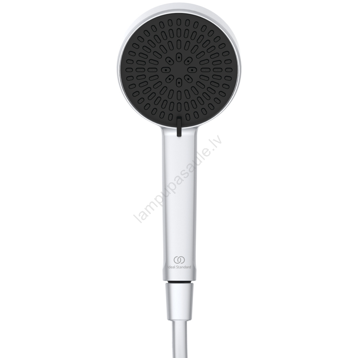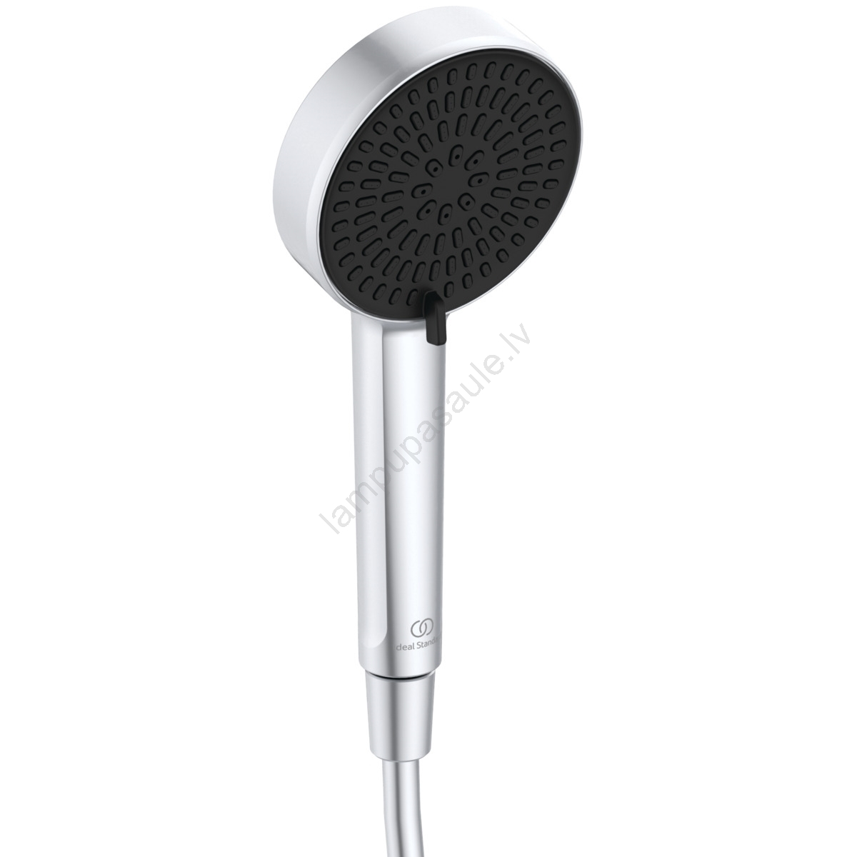 • Komplektā ietilpst dušas stienis 1113 mm garumā ar slīdošu turētāju, divām augstuma regulējamām plauktām un IdealFlex šļūteni 1750 mm garumā.