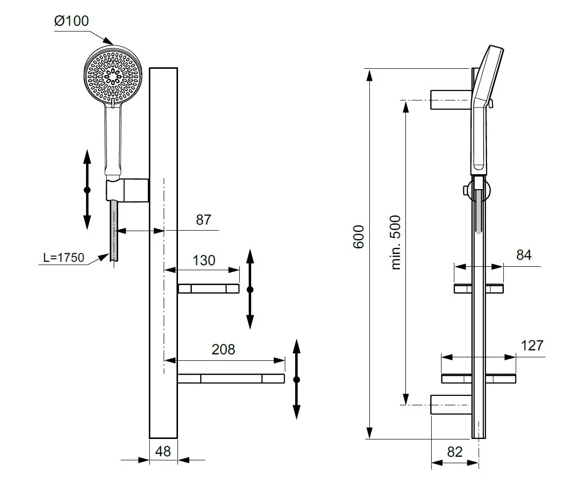 • Dušas stienim kopējais garums ir 600 mm un minimālais stiprinājuma attālums ir 500 mm.