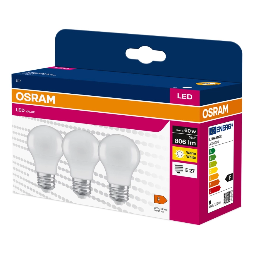 Komplekts: 3× LED spuldze A60, E27, 8 W, 230 V, 3000 K - Osram