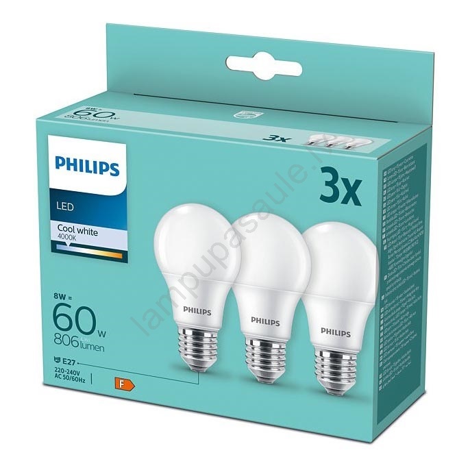 KOMPLEKTS 3xLED Spuldze Philips A60 E27/8W/230V 4000K Augstas kvalitātes dizains nodrošinās perfektu jūsu interjera apgaismojumu. E27 kategorija ir veltīta spuldzēm ar tādu pašu cokolu. Mūsu e-veikalā varat izvēlēties spuldzes ar tradicionālo kvēldiegu vai modernās LED spuldzes, kas ir energoefektīvākas un ar ilgāku darbības laiku.