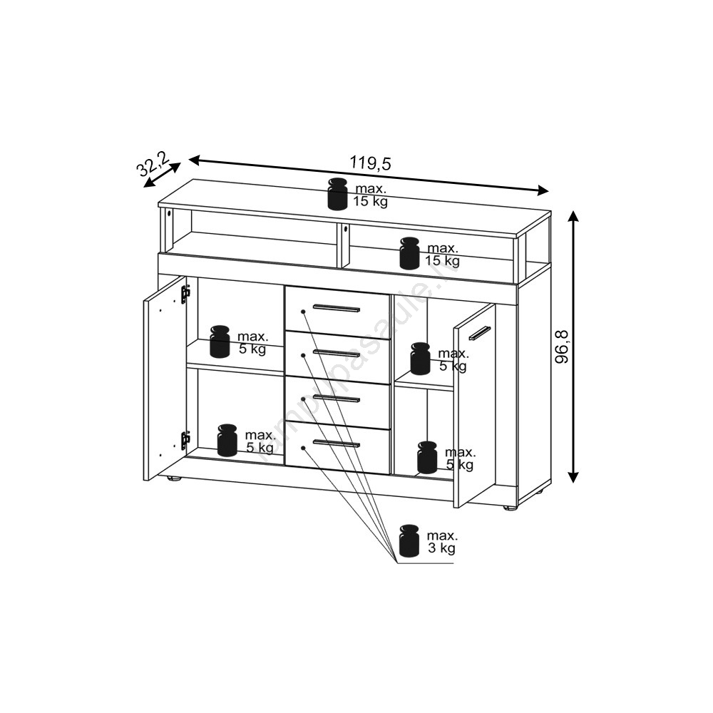 • Augšējā virsma ir pietiekami plaša, lai novietotu dekorācijas, elektroniku vai citus nepieciešamos priekšmetus.