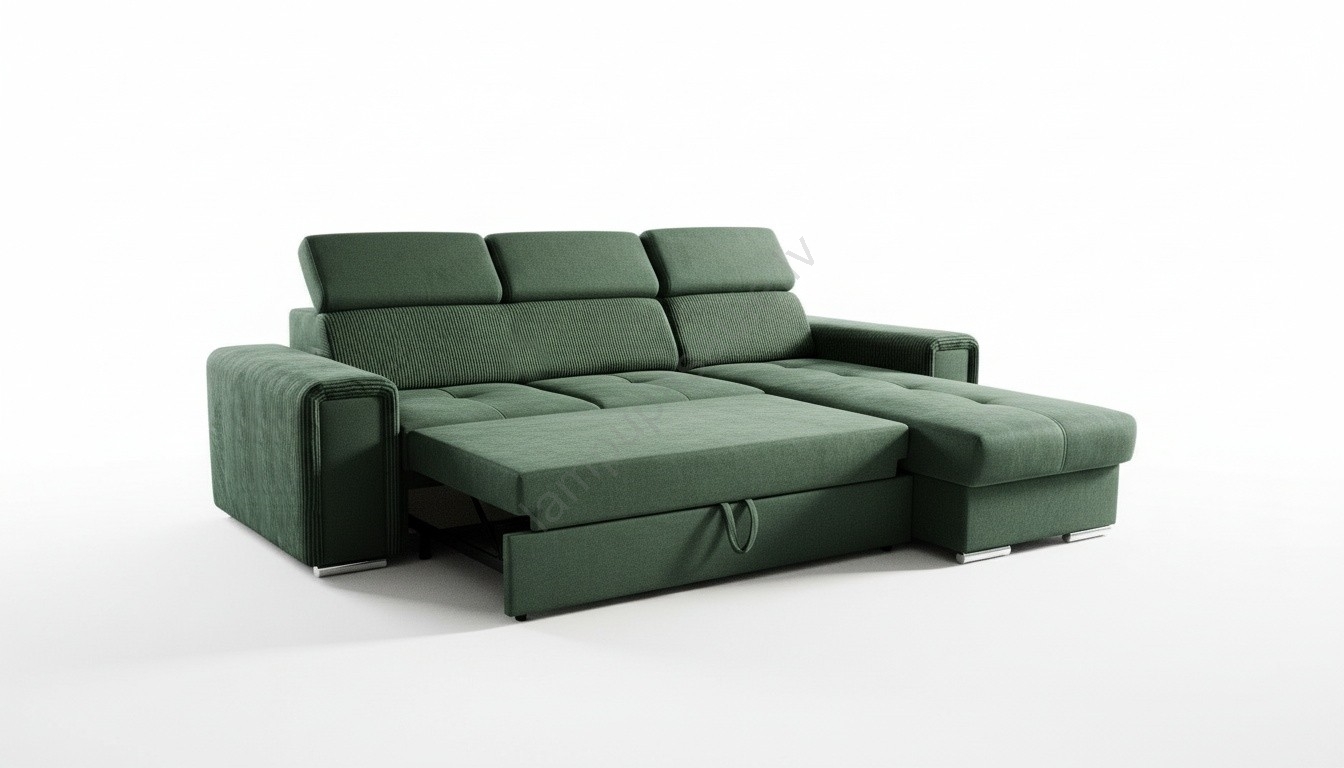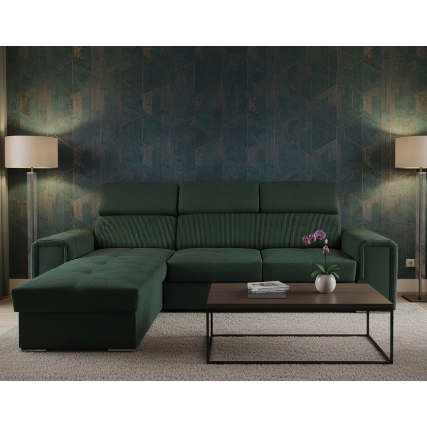 • Universāls L formas izvelkamais stūra dīvāns SALVADA ar ietilpīgu uzglabāšanas nodalījumu — zaļš