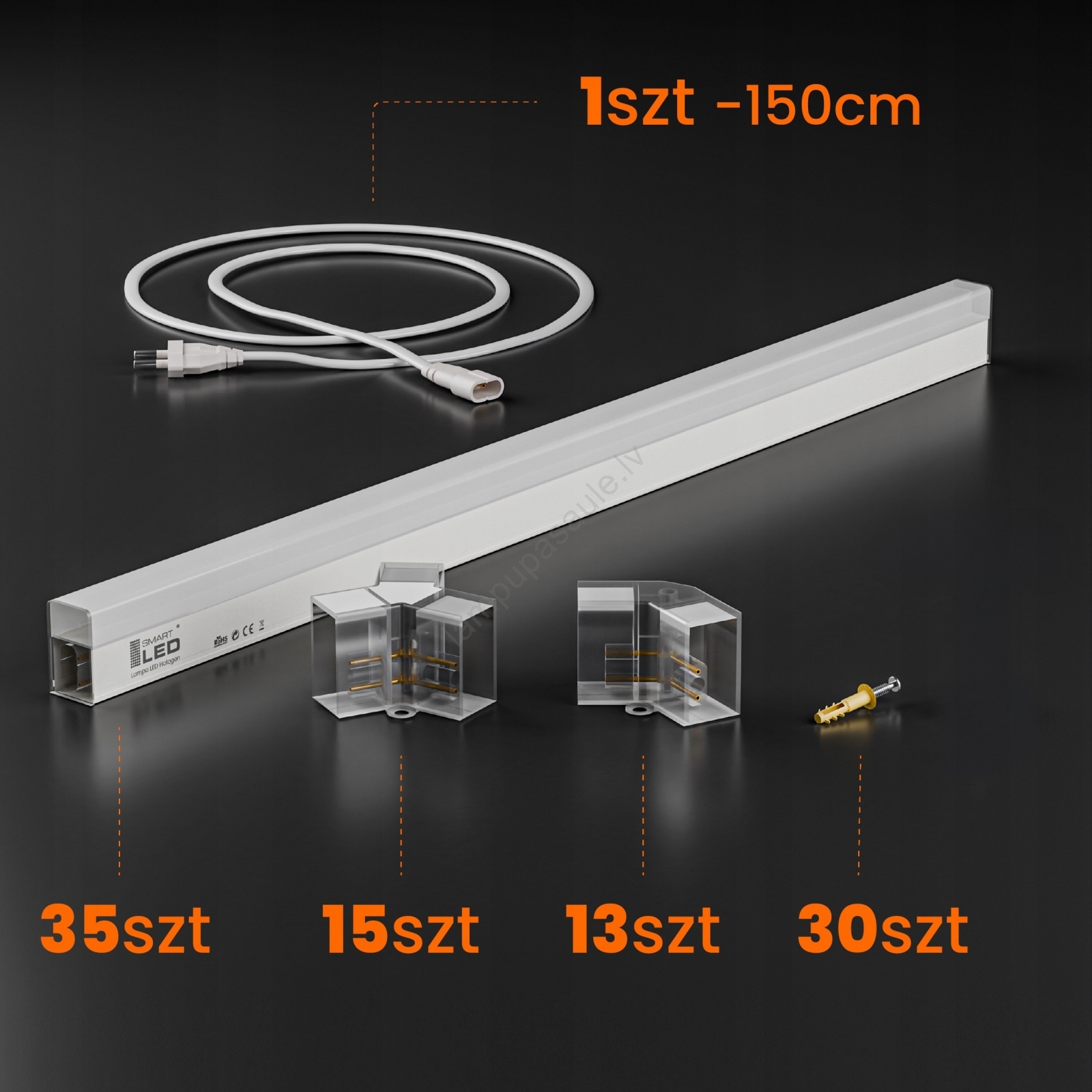 • Iepakojuma saturs: barošanas kabelis (150 cm), 35 LED paneļi, 15 trīskārši savienotāji, 13 leņķveida savienojumi, 30 dībeļu + skrūvju, montāžas piederumi (plastmasas cilpas vai metāla konsoles pēc izvēles).