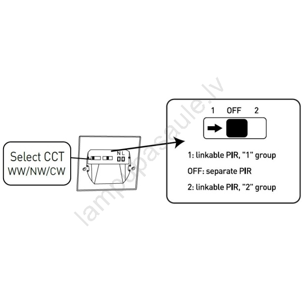 • Iespēja mainīt gaismas krāsu temperatūru (silti balta - neitrāla balta - auksti balta) ar slēdzi uz gaismekļa aizmugures.