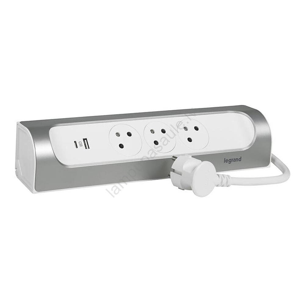 Legrand 049406 – pagarinātājs ar 3 kontaktligzdām (E tips) + USB‑A + USB‑C, 1 m, sudraba/balts