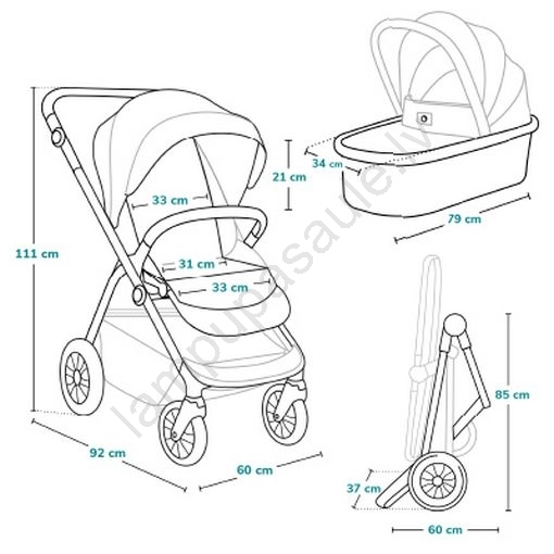 • Piederumu komplekts: kāju pārvalks, lietus pārsegs, moskītu tīkls, soma ar kabatām un pastiprinātu dibenu, adapteri auto sēdeklim.