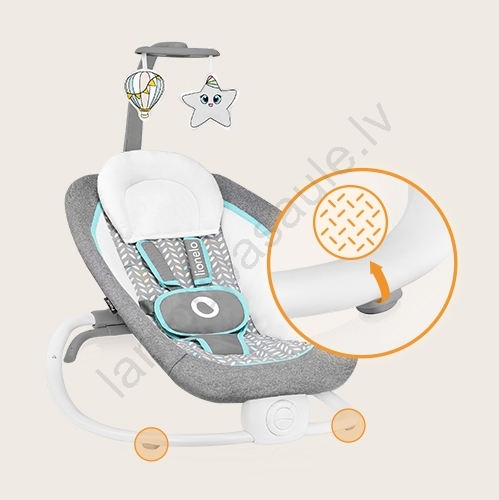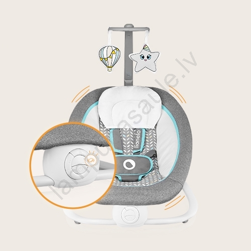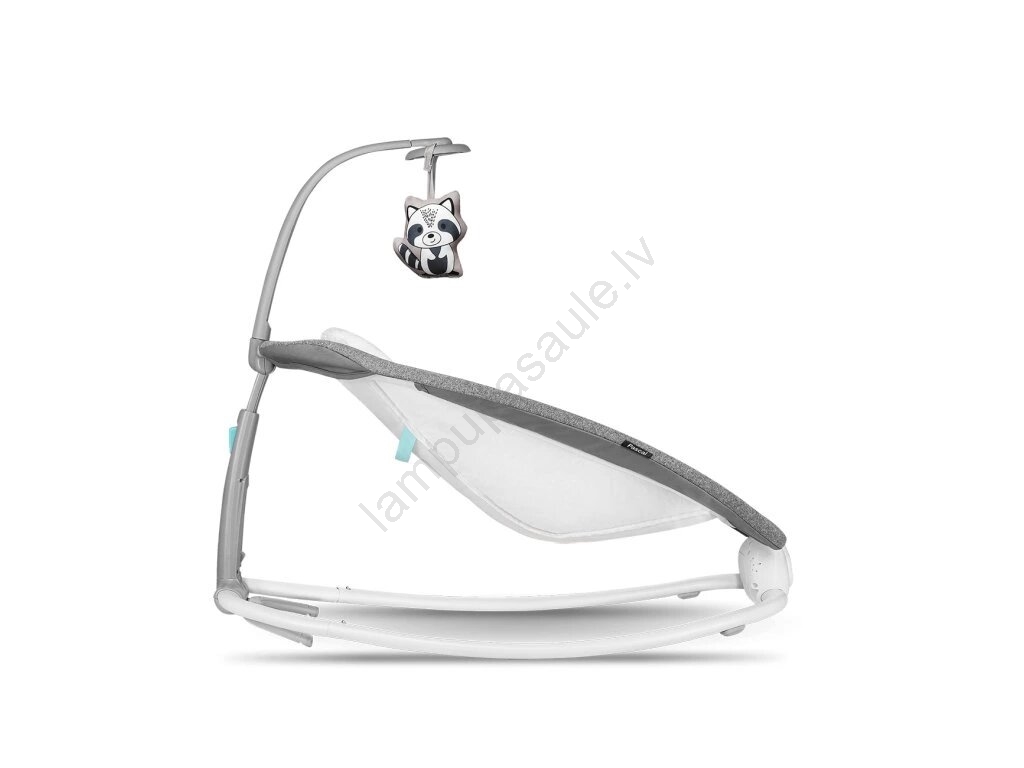 • Šūpuļkrēsls ietver noņemamu rotaļu stieni ar piekārto rotaļlietu, kas nodrošina izklaidi spēles laikā.