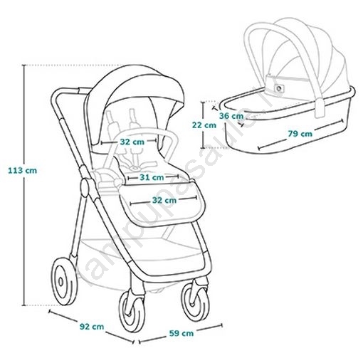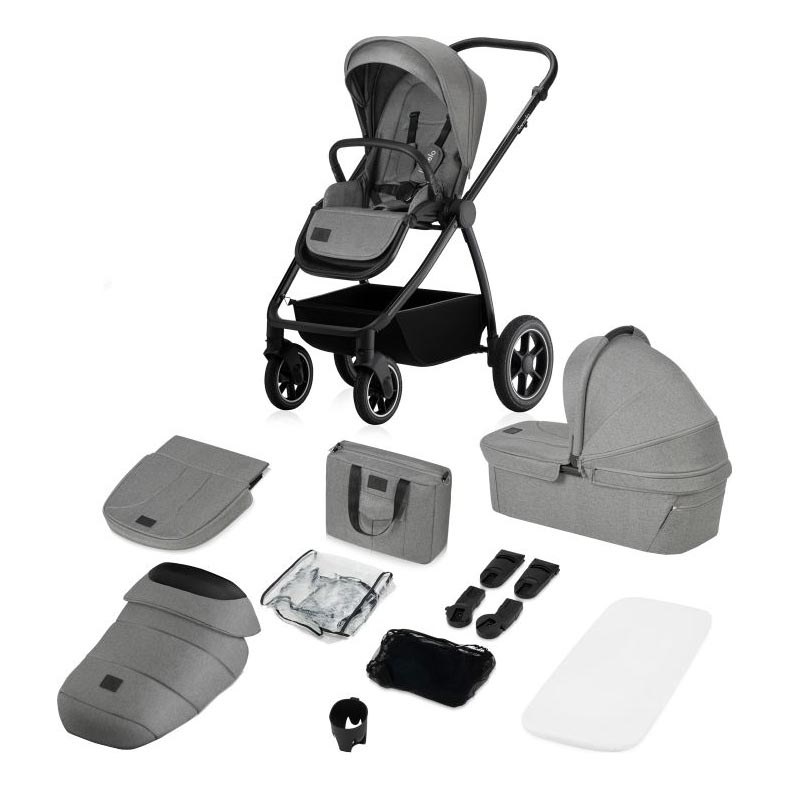 • Piederumu komplekts: kāju pārsegs, moskītu tīkls, kulbas pārvalks, lietus pārsegs, soma vecākiem, krūzes turētājs, grozs ar aizslēgšanu.