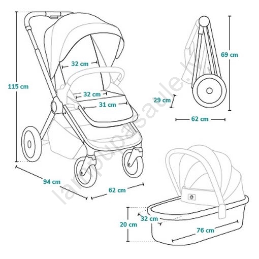• Bagātīgs piederumu komplekts: lietus pārsegs, moskītu tīkls, saules nojume, kāju pārvalks 2 vienā, dzērienu turētājs, soma, adapteri.