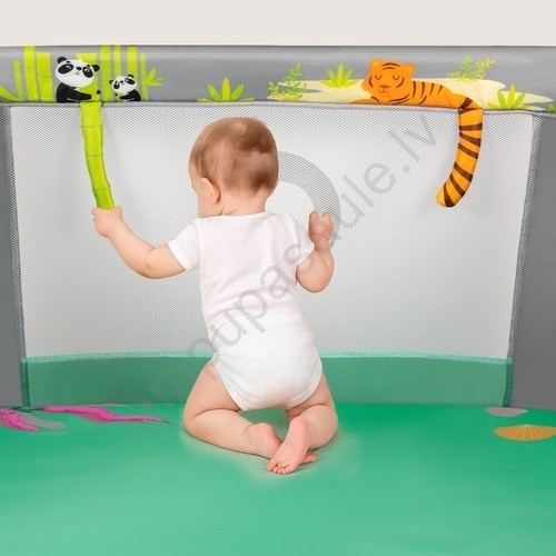 • Tai ir iebūvēts paklājs ar krāsainiem dzīvnieku zīmējumiem un rotaļlietām, kas stiprināmas ar lipekļa lenti, kas rosinās ziņkārību un attīstīs bērna iztēli un motorikas prasmes.