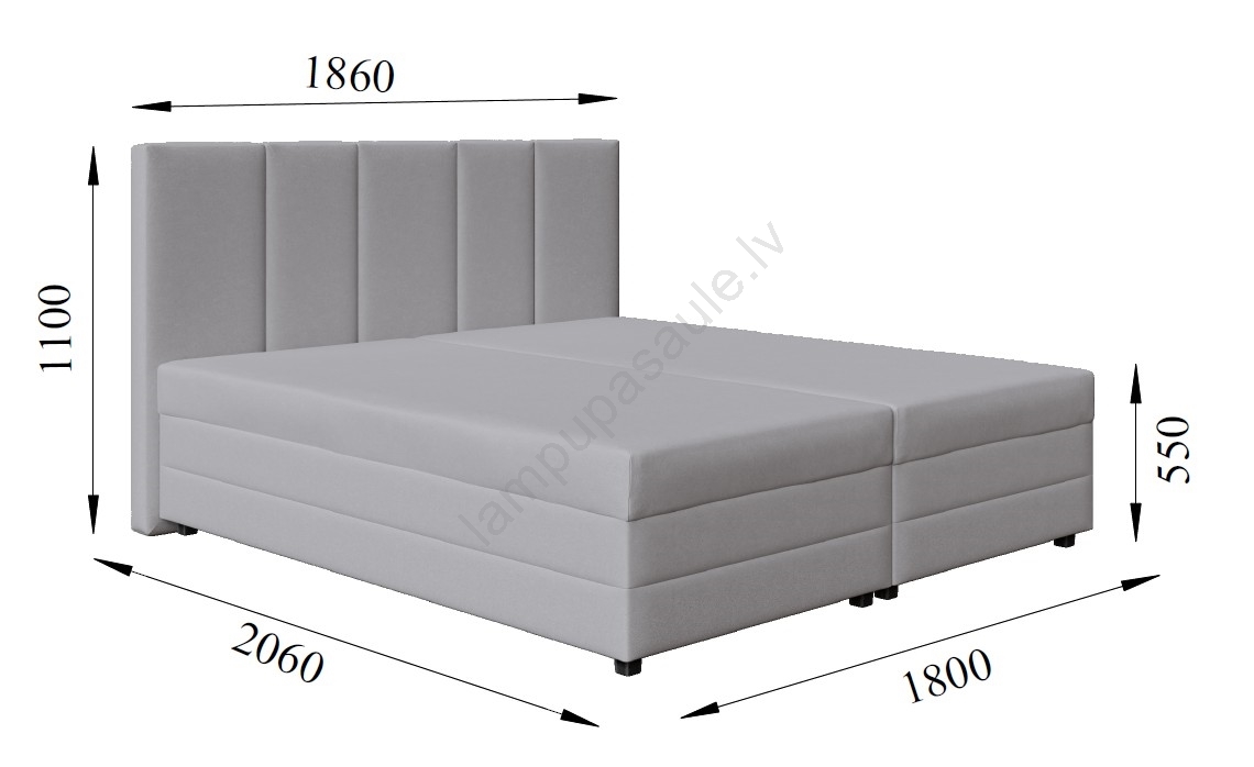 • Polsterēta divvietīga gulta ar atsperu matračiem un augstu, taisnu elegantu galvgali.