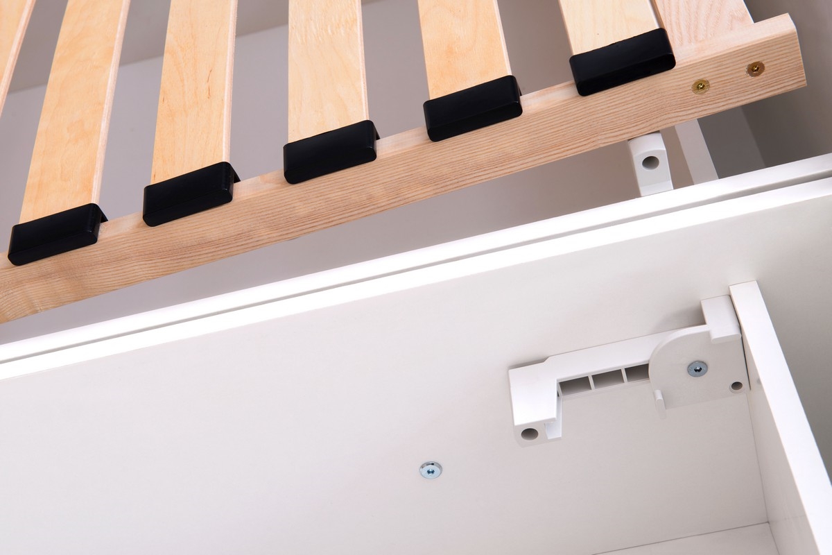 • Gulta aprīkota ar lielu uzglabāšanas telpu ar piekļuvi no gultas kāju puses, lai uzglabātu gultas veļu un citus priekšmetus.
